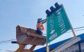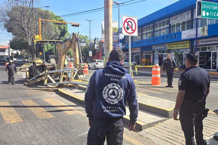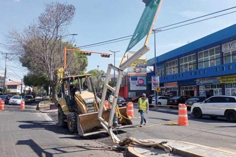 Personal del Ayuntamiento de Tlaxcala realizó la mañana de este viernes maniobras con retroexcavadora y camión para retirar la estructura metálica de un semáforo dañado en la zona de La Garita, en la capital del estado.