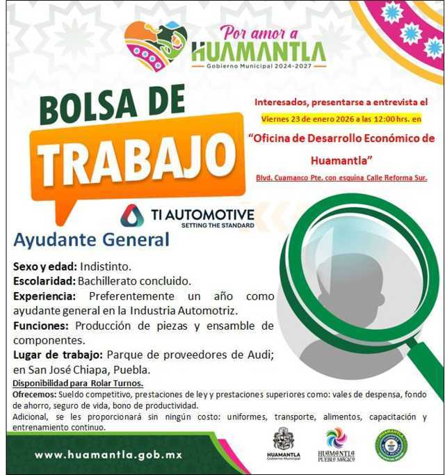 El Gobierno Municipal de Huamantla, a través de la Bolsa de Trabajo, invita a la ciudadanía interesada a participar en el proceso de reclutamiento para la empresa TI Automotive, que ofrece vacantes para el puesto de Ayudante General en la industria automotriz.