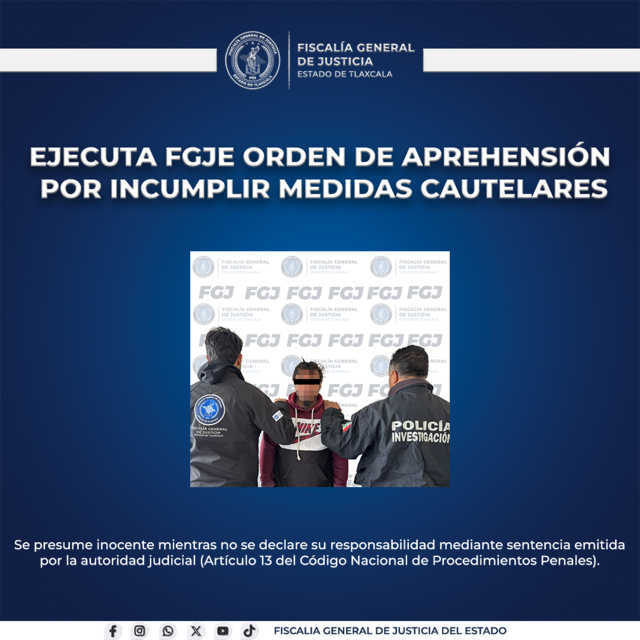 La Policía de Investigación realizó las labores de búsqueda, y el imputado fue aprehendido en el municipio de Zacatelco, donde se le informaron los derechos que le asisten como persona detenida, así como el motivo de su detención.