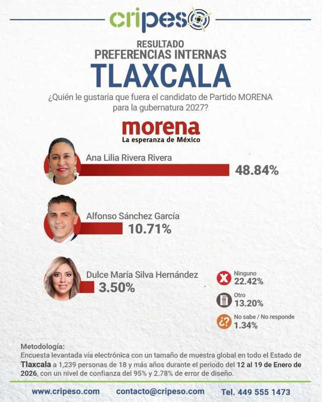 El proceso rumbo a la gubernatura de Tlaxcala en 2027 comienza a mostrar tendencias claras. De acuerdo con un levantamiento realizado por la casa encuestadora CRIPES, el partido MORENA mantiene una amplia ventaja en intención de voto, mientras que la senadora Ana Lilia Rivera Rivera se posiciona como la figura con mayor respaldo ciudadano al interior del movimiento.