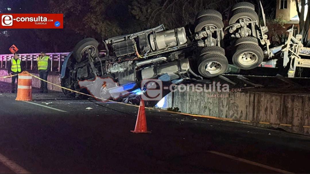 La madrugada de este lunes se registró la volcadura de un tractocamión acoplado a un contenedor sobre la carretera Tlaxcala–Apizaco, a la altura del kilómetro 28, en la comunidad de Tizatlán.