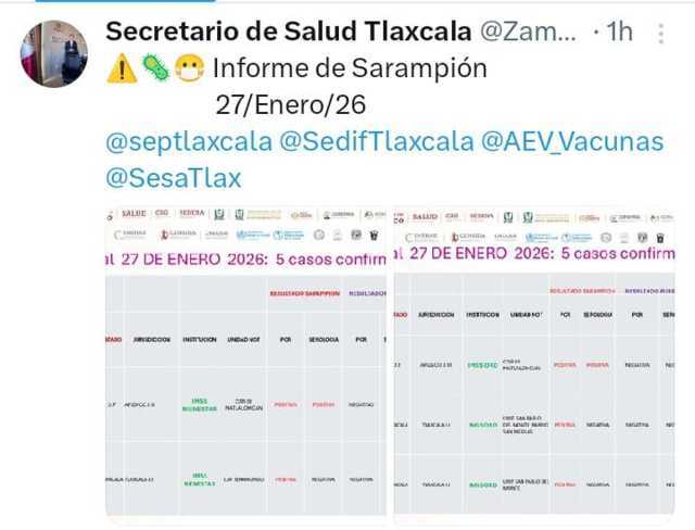 Zamudio Meneses publicó en su cuenta de "X" los informes del comportamiento de la enfermedad en Tlaxcala, donde se dieron a conocer los tres casos positivos identificados recientemente. En todos ellos, se han implementado cercos sanitarios para completar los esquemas de vacunación en la población cercana a los casos identificados.