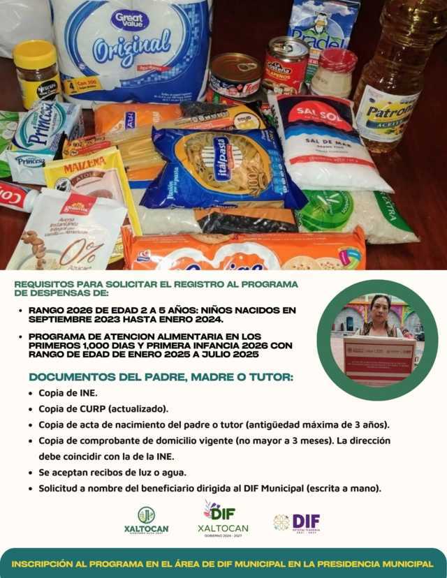 El H. Ayuntamiento de Xaltocan, presidido por el Dr. José Luis Hernández Vázquez, a través del DIF Municipal y en coordinación con el DIF Estatal, invita a las madres, padres y tutores a registrarse en los programas de asistencia alimentaria 2026.