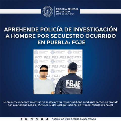 La colaboración interinstitucional entre la Fiscalía General de Justicia del Estado (FGJE) y la Fiscalía General del Estado de Puebla (FGE) permitió la aprehensión de Enrique N., por su probable responsabilidad en el delito de secuestro agravado, cometido en el estado de Puebla.