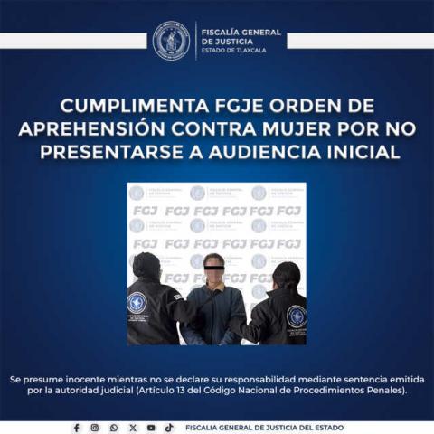 Agentes de la Policía de Investigación de la Fiscalía General de Justicia del Estado (FGJE) aprehendieron a Juana María N., por no presentarse a la audiencia inicial, dentro del proceso que enfrenta por los delitos de falsedad ante autoridades y fraude procesal.