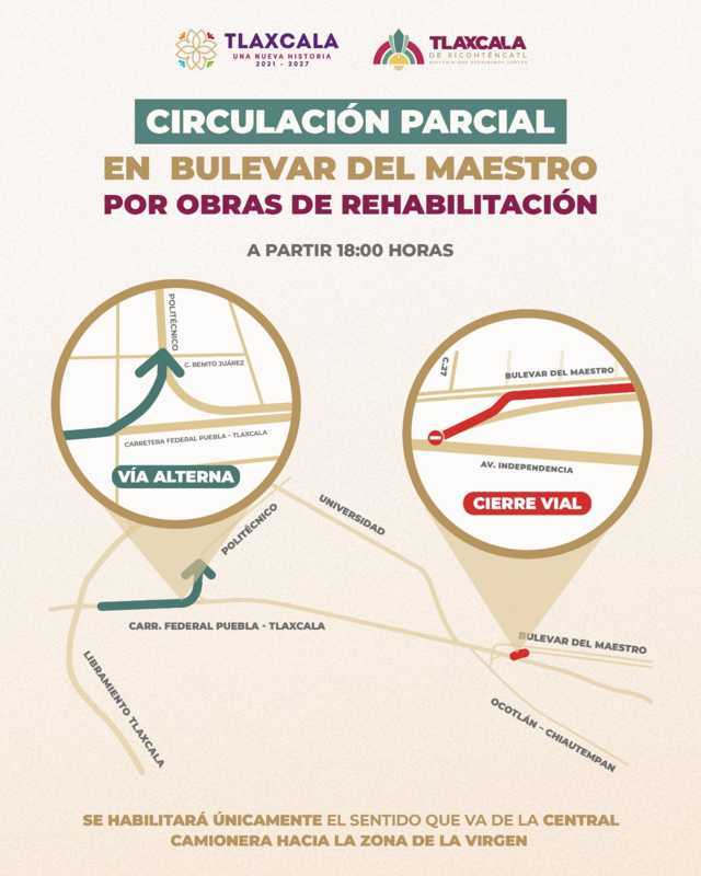 El Ayuntamiento de Tlaxcala informó que, como parte de los trabajos de rehabilitación del Bulevar del Maestro, a partir de este miércoles a las 18:00 horas se implementará una circulación parcial en esta vialidad, por lo que se habilitará únicamente el sentido que va de la Central Camionera hacia la zona de La Virgen.