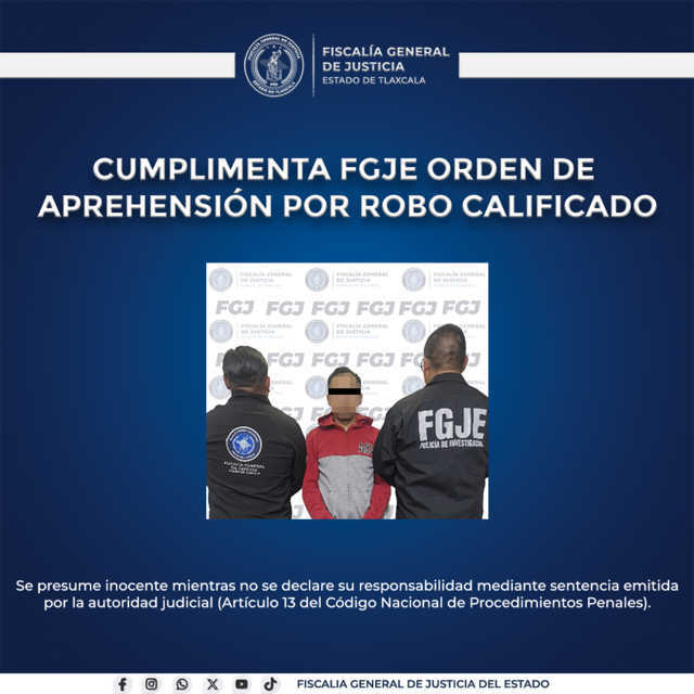 La Fiscalía General de Justicia del Estado (FGJE), en coordinación con la Fiscalía General del Estado de Puebla (FGE), cumplimentó una orden de aprehensión en contra de Oliver N., por el delito de robo calificado.