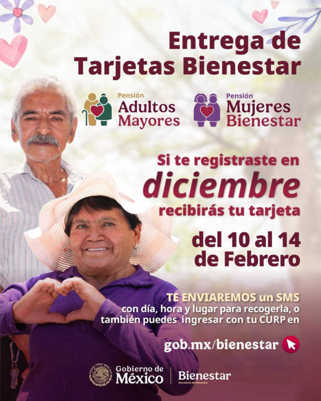 El Gobierno de México, a través de la Secretaría del Bienestar, informó que, del 10 al 14 de febrero, comienza la entrega de las Tarjetas Bienestar a quienes se registraron en diciembre a las Pensiones de Adultos Mayores y Mujeres Bienestar, por lo que recibirán un mensaje SMS con el día y lugar para recogerla.