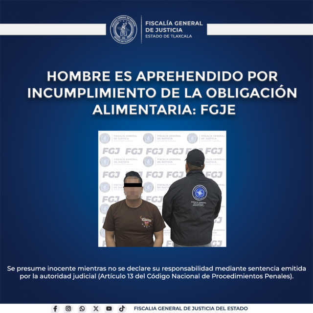 La Policía de Investigación de la Fiscalía General de Justicia del Estado (FGJE) aprehendió a Aristeo N. por el delito de incumplimiento de la obligación alimentaria, en perjuicio de su hijo menor de edad.