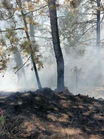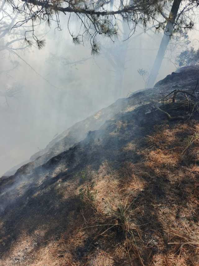 Al arribar al lugar, el personal constató la presencia de fuego que afectaba pastizal, arbustos y residuos de pino, por lo que se iniciaron de inmediato las labores para sofocar el incendio y evitar su propagación a zonas aledañas.