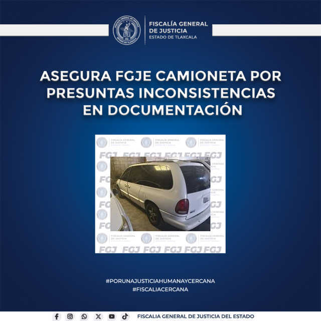 Elementos de la Policía de Investigación de la Fiscalía General de Justicia del Estado (FGJE) aseguraron una camioneta marca Dodge, tipo Voyager, modelo 1997, por presuntas inconsistencias en la documentación presentada para un trámite de reemplacamiento.