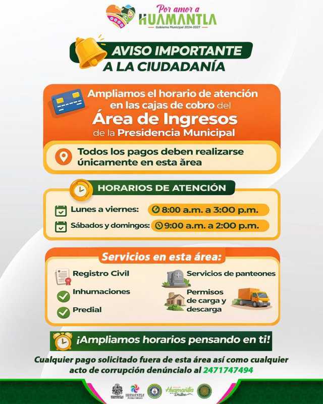 El alcalde destacó que esta medida busca apoyar a las familias huamantlecas, permitiendo que puedan cumplir con sus obligaciones municipales con mayor comodidad, incluso durante el fin de semana.