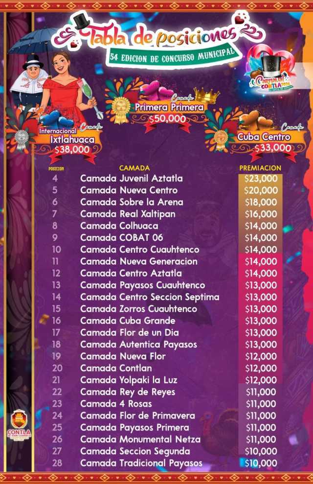 Durante la ceremonia del anuncio oficial los oradores del evento dieron a conocer la tabla de posiciones oficial quienes informaron que a los tres primeros lugares obtuvieron premios en efectivo de 50 mil, 38 mil y 33 mil pesos, respectivamente.
