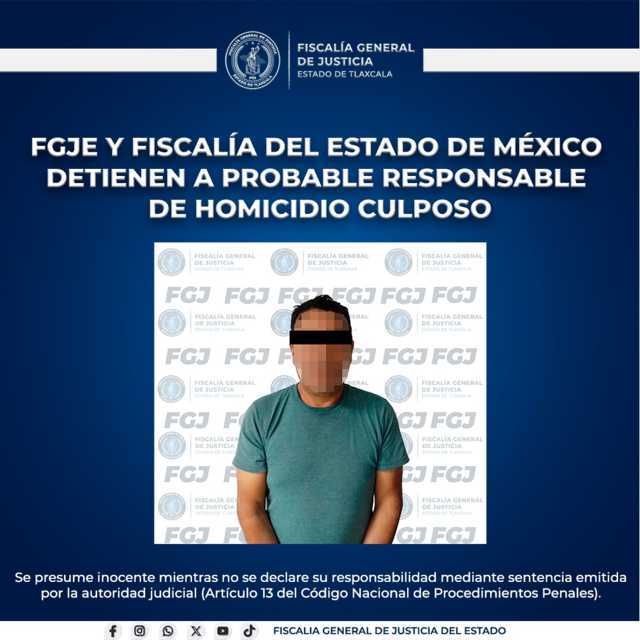 La Fiscalía General de Justicia del Estado (FGJE), en colaboración con la Fiscalía General de Justicia del Estado de México (FGJEM), detuvo a José de Jesús N., por su probable responsabilidad en el delito de homicidio culposo, ocurrido en el Estado de México.