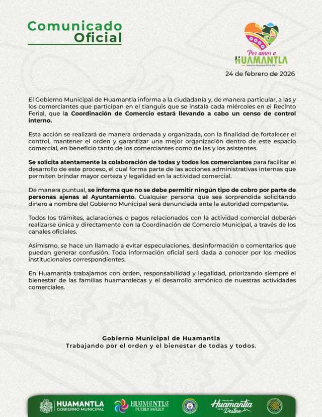 Con estas acciones, el Gobierno Municipal de Huamantla reafirma su compromiso de trabajar con orden, responsabilidad y legalidad, priorizando siempre el bienestar de las familias huamantlecas y el desarrollo armónico de las actividades económicas del municipio.