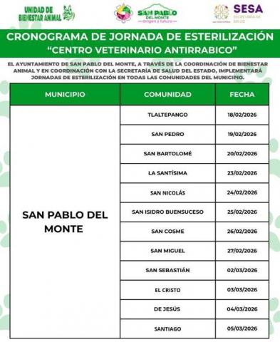 El Ayuntamiento de San Pablo del Monte, a través de la Coordinación de Bienestar Animal, mantiene vigentes las jornadas de esterilización gratuitas de perros y gatos en todas las comunidades del municipio.