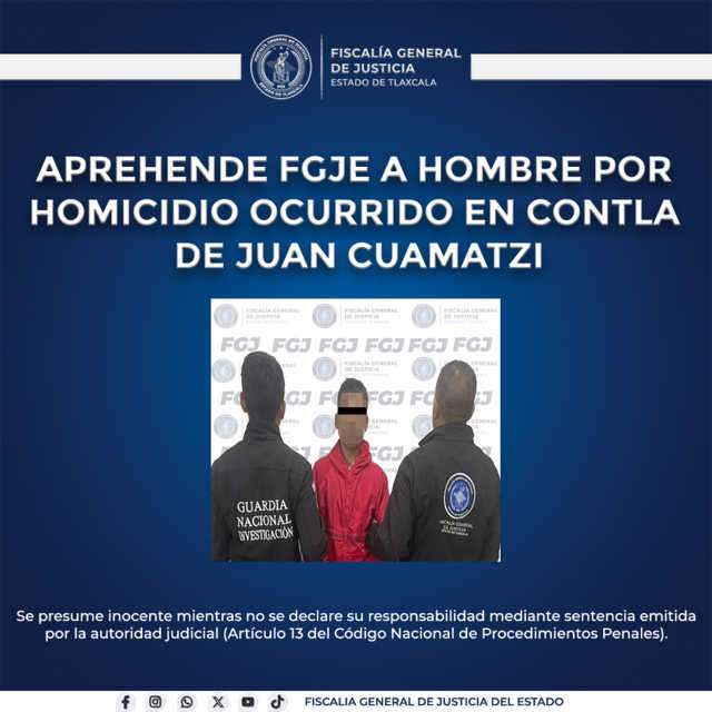 Los trabajos de inteligencia realizados por la Policía de Investigación permitieron que la Fiscalía General de Justicia del Estado (FGJE) aprehendiera a Mauricio N., alias “Tecolín”, por el delito de homicidio calificado, ocurrido en el municipio de Contla de Juan Cuamatzi.