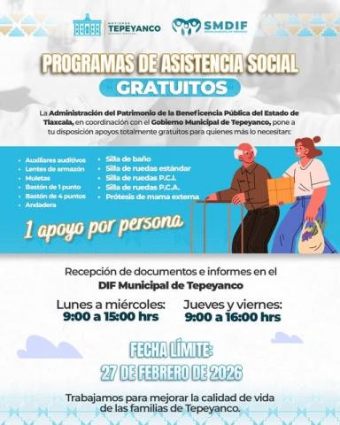 En coordinación con la Beneficencia Pública del Estado, ponemos a disposición apoyos totalmente gratuitos como auxiliares auditivos, lentes, muletas, bastones, andaderas, sillas de ruedas y prótesis de mama externa.
