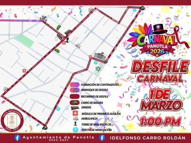 El Presidente Municipal, Idelfonso Carro Roldán, invita cordialmente a todas las familias de Panotla y visitantes a ser parte del Gran Desfile de Carnaval Panotla 2026, que se realizará este domingo 1 de marzo a partir de la 1:00 de la tarde, una celebración que reunirá tradición, cultura y alegría en un ambiente totalmente familiar.