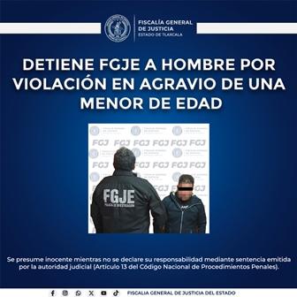 La Policía de Investigación de la Fiscalía General de Justicia del Estado (FGJE) aprehendió a Jesús N. por el delito de violación, en agravio de una menor de edad.