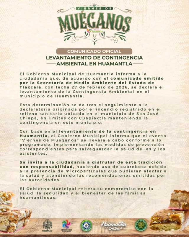 El Gobierno Municipal de Huamantla informa a la ciudadanía que, de acuerdo con el comunicado emitido por la Secretaría de Medio Ambiente del Estado de Tlaxcala, con fecha 27 de febrero de 2026, se declara el levantamiento de la Contingencia Ambiental en el municipio de Huamantla.