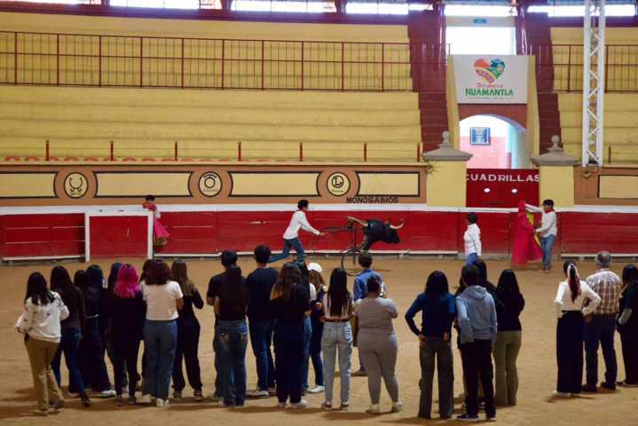 Finalmente, visitaron la Plaza de Toros de Huamantla, donde recibieron una demostración práctica sobre la forma en que se lidia el toro con capotes y muletas, complementando la experiencia teórica con una aproximación vivencial al arte taurino.