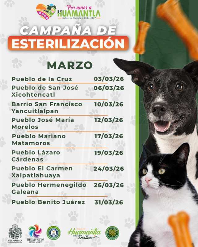 El Ayuntamiento de Huamantla, que presiden Salvador Santos Cedillo, anunció el lanzamiento de una intensa Campaña de Esterilización de Perros y Gatos, que busca promover el bienestar animal y controlar la sobrepoblación de mascotas, que se llevará a cabo del 03 al 31 de marzo en diferentes comunidades del municipio.