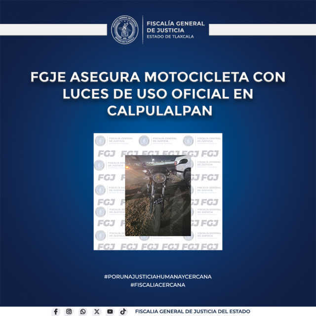 Elementos de la Policía de Investigación de la Fiscalía General de Justicia del Estado (FGJE) aseguraron una motocicleta marca Italika, modelo FT150, color negro con rojo, que portaba luces estroboscópicas de uso exclusivo para corporaciones oficiales.
