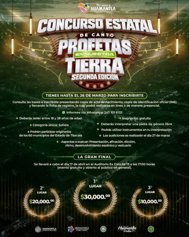 El Gobierno del Municipio de Huamantla, a través de la Dirección de Bienestar y la Coordinación de Juventud, convoca al concurso estatal de canto “Profetas en Nuestra Tierra”, una iniciativa que busca impulsar el talento juvenil y fomentar la expresión artística a través de la música.