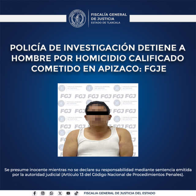 Las labores de inteligencia realizadas por la Policía de Investigación de la Fiscalía General de Justicia del Estado (FGJE) permitieron la detención de Raúl N., por su probable responsabilidad en el delito de homicidio calificado, ocurrido en el municipio de Apizaco.
