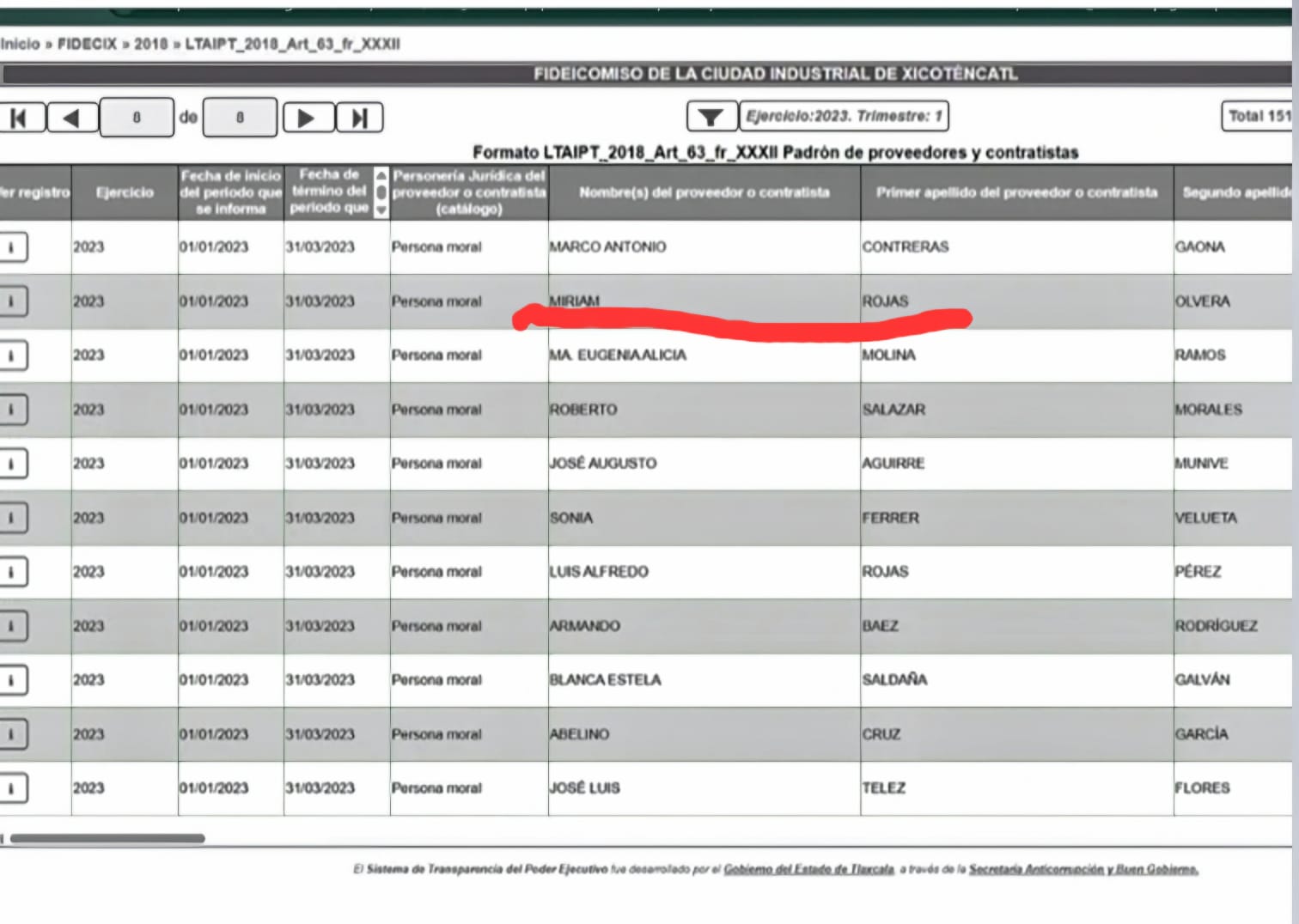 Miriam Rojas Olvera, una de las personas detenidas por la Fiscalía General del Estado de Tlaxcala en el caso del doble homicidio del matrimonio Tello Ruiz —Alexandro Agustín Tello Olmedo y Karina de los Ángeles Ruiz Ruiz—, mantiene una relación contractual documentada con el gobierno estatal durante la actual administración.