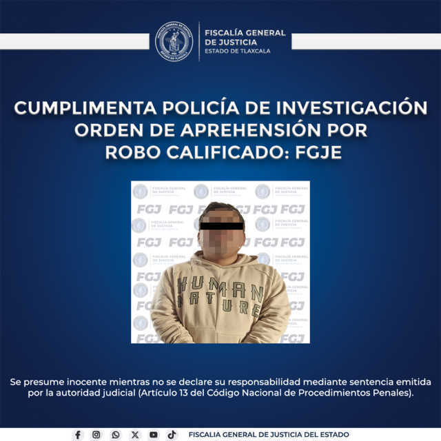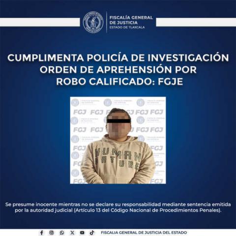 La Fiscalía General de Justicia del Estado (FGJE), a través de la Policía de Investigación, cumplimentó una orden de aprehensión en contra de Jorge Iván N., por su probable responsabilidad en el delito de robo calificado.