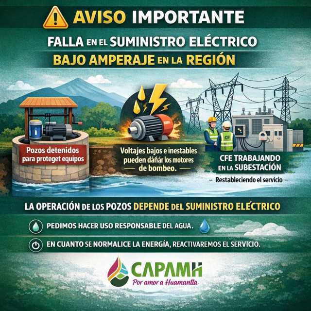 CAPAMH informa a la ciudadanía que derivado de una falla en el suministro eléctrico en la región, actualmente se registra bajo amperaje en la red de energía, situación que afecta la operación de los equipos de bombeo de los pozos que abastecen de agua potable al municipio.