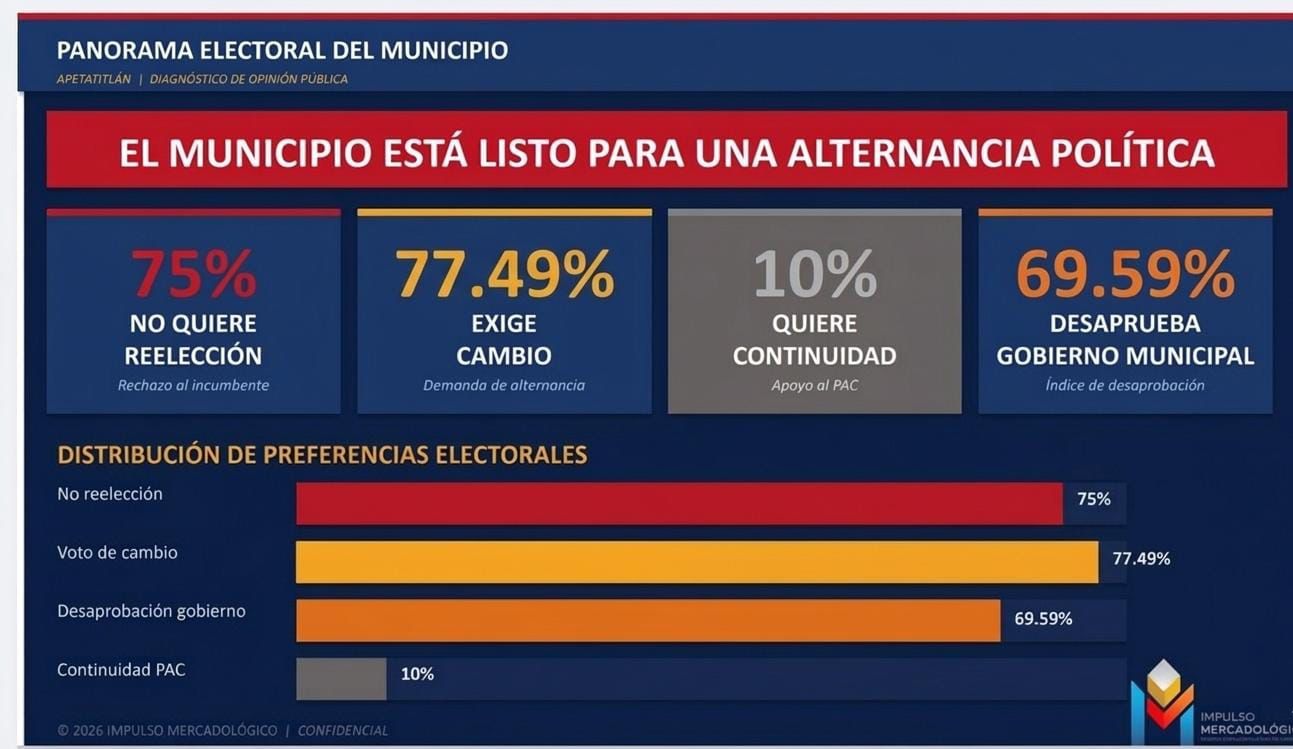 Apetatitlán, Tlaxcala.— El ánimo ciudadano en el municipio apunta hacia un cambio político. De acuerdo con una reciente medición de la empresa Impulso Mercadologico realizada entre habitantes de las 7 secciones electorales más del 75% de los ciudadanos encuestados manifestó su rechazo a una posible reelección del actual gobierno municipal, encabezado por el alcalde Azain Ávalos Marbán, mientras que apenas el 10% considera que debería continuar gobernando el Partido Alianza Ciudadana.