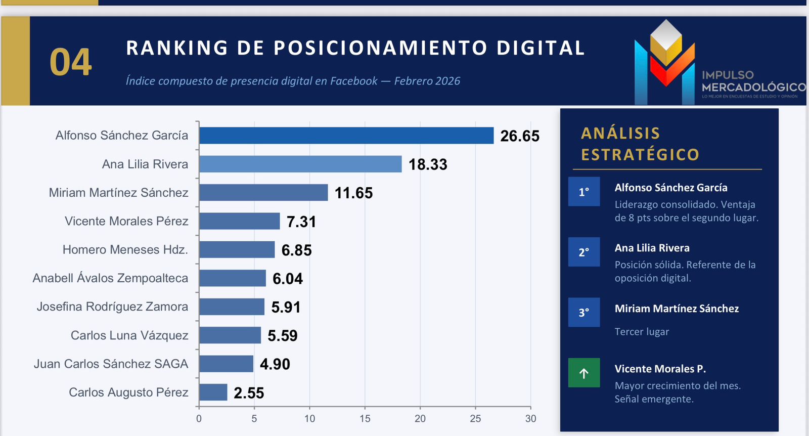 Según el más reciente estudio de la consultora Impulso Mercadológico y con un 26% de las menciones y búsquedas, Alfonso Sánchez García encabeza el ranking de posicionamiento digital, logrando una ventaja estratégica significativa sobre otros perfiles de relevancia nacional y estatal.
