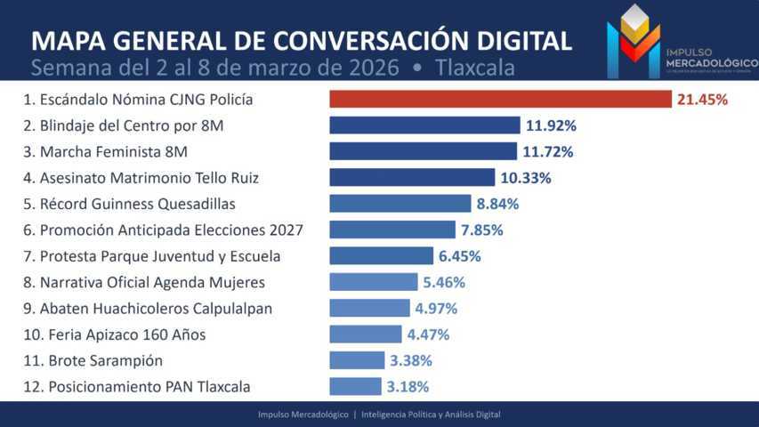 TLAXCALA, Tlax. – 10 de marzo de 2026 – El más reciente reporte de "Escucha Digital en Tlaxcala", elaborado por Impulso Mercadológico, revela un panorama de alta tensión social y crisis institucional durante la semana del 2 al 8 de marzo de 2026. El análisis de las redes sociales y medios digitales en el estado destaca que la indignación es el sentimiento predominante entre la ciudadanía, alcanzando un 44% de la conversación total.