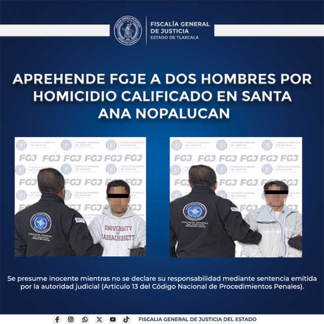Derivado de las labores de inteligencia realizadas por la Policía de Investigación, la Fiscalía General de Justicia del Estado (FGJE) aprehendió a Lino N. y Lino N. por el delito de homicidio calificado, ocurrido en Santa Ana Nopalucan.