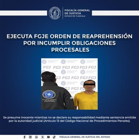 La Policía de Investigación de la Fiscalía General de Justicia del Estado (FGJE) ejecutó una orden de reaprehensión contra Armando N., por incumplir las obligaciones procesales impuestas por el Juez Penal del sistema tradicional en el proceso que enfrenta por el delito de incumplimiento de la obligación alimentaria, en agravio de su hijo menor de edad.