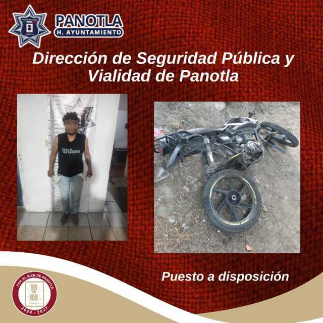 La Dirección de Seguridad Pública y Vialidad del municipio de Panotla informa que, derivado de los recorridos preventivos que se realizan de manera permanente para inhibir actos delictivos, se logró la detención de un masculino identificado como Iván N., de 40 años de edad, quien presuntamente habría robado una motocicleta marca Vento en la comunidad de San Jorge Tezoquipan.
