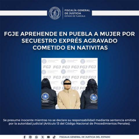 Como resultado de las labores de inteligencia realizadas por la Policía de Investigación, la Fiscalía General de Justicia del Estado (FGJE) logró la detención de Diana N., por su probable responsabilidad en el delito de secuestro exprés agravado.