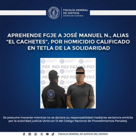 Gracias a las labores de inteligencia realizadas por la Policía de Investigación, la Fiscalía General de Justicia del Estado (FGJE) logró la detención de José Manuel N., alias “El Cachetes”, por el delito de homicidio calificado, ocurrido en Tetla de la Solidaridad.