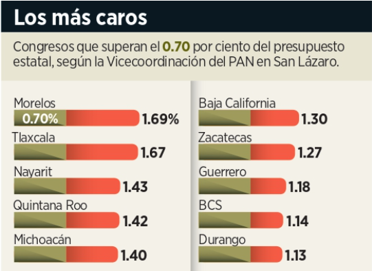 De acuerdo con el estudio, los Congresos más caros son los de Morelos, con 1.69 por ciento del presupuesto estatal, seguido de Tlaxcala, con el 1.67 por ciento; Nayarit, con 1.43 por ciento; Quintana Roo, con 1.42 por ciento; Michoacán, con 1.4 por ciento; Baja California, con 1.3 por ciento; Zacatecas, con 1.27 por ciento; Guerrero, con 1.18 por ciento; Baja California Sur, con 1.14 por ciento y Durango, con 1.13 por ciento.