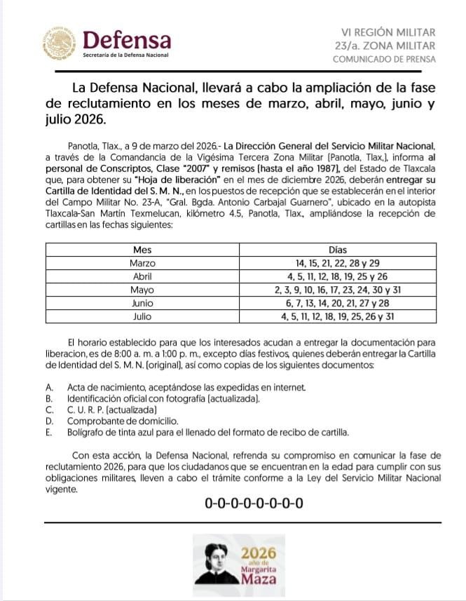 Las y los interesados deberán acudir a entregar su Cartilla de Identidad del Servicio Militar Nacional en el Campo Militar No. 23-A “Gral. Bgda. Antonio Carbajal Guarneros”, en Panotla, Tlaxcala.