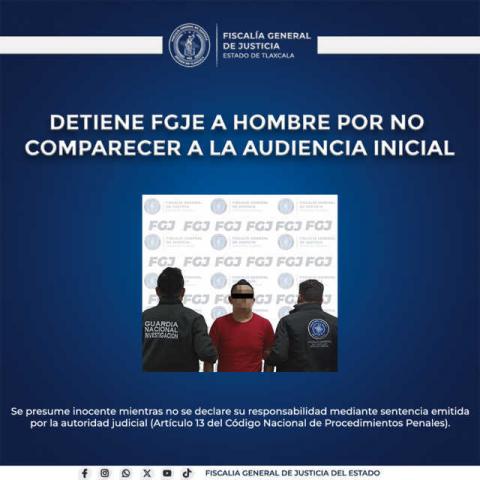 Elementos de la Policía de Investigación de la Fiscalía General de Justicia del Estado (FGJE) detuvieron a Francisco N., por no comparecer a la audiencia inicial dentro del proceso que enfrenta por el delito de incumplimiento de la obligación alimentaria.