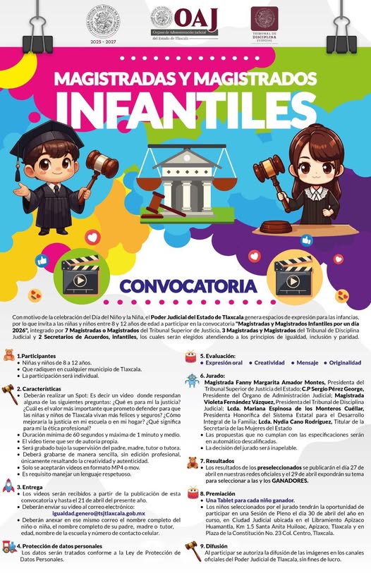 La convocatoria va dirigida a niñas y niños de entre 8 y 12 años que radiquen en cualquier municipio de Tlaxcala, quienes deberán realizar un spot sin ninguna edición en el que respondan alguna de las preguntas ¿Qué es para mí la justicia? ¿Cuál es el valor más importante que prometo defender para que las niñas y niños de Tlaxcala vivan más felices y seguros? ¿Cómo mejoraría la justicia en mi escuela o en mi hogar? ¿Qué significa para mí la ética profesional?.