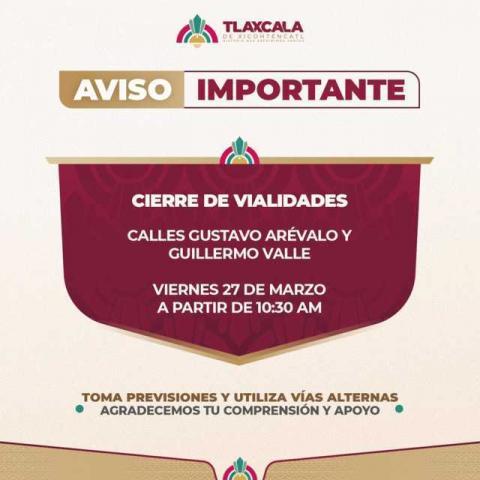 La Dirección de Seguridad, Protección Ciudadana y Movilidad del Ayuntamiento de Tlaxcala implementará este viernes un operativo especial para despejar las calles Gustavo Arévalo y Guillermo Valle, a partir de las 10:30 horas, con el objetivo de asegurar el libre tránsito de los carros alegóricos que participarán en el desfile Señorita Universidad UATx.