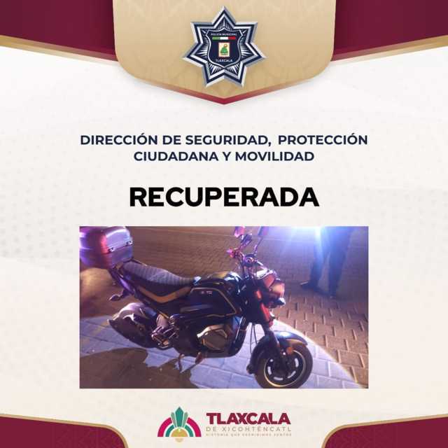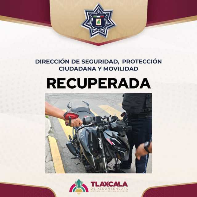 Elementos de la Dirección de Seguridad, Protección Ciudadana y Movilidad del municipio de Tlaxcala lograron la recuperación de una motocicleta con reporte de robo, tras atender un llamado ciudadano en Tlapancalco.