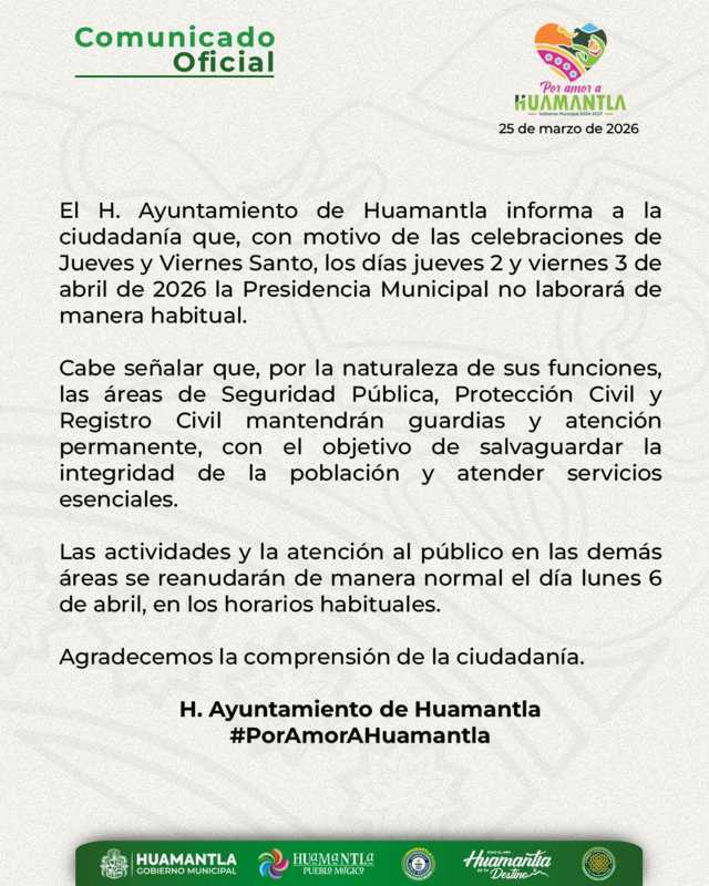 El H. Ayuntamiento de Huamantla informa a la ciudadanía que, con motivo de las celebraciones de Jueves y Viernes Santo, los días jueves 2 y viernes 3 de abril de 2026 la Presidencia Municipal no laborará de manera habitual.