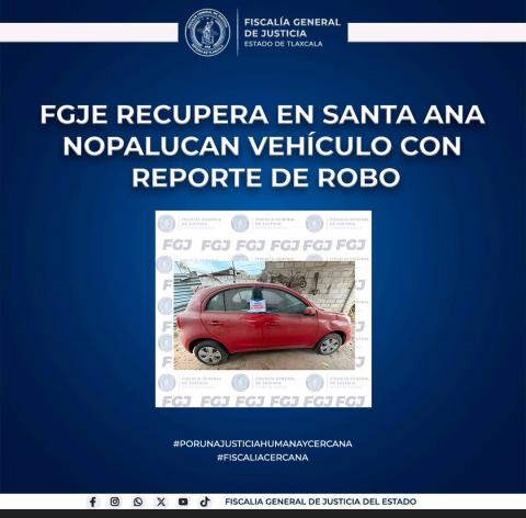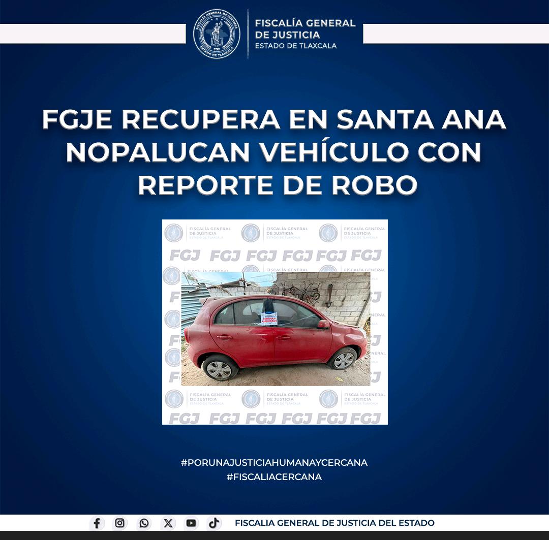 La Policía de Investigación de la Fiscalía General de Justicia del Estado (FGJE) cumplimentó una orden de cateo en Santa Ana Nopalucan, donde recuperó un vehículo que contaba con reporte de robo vigente.