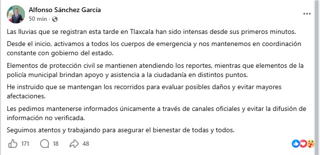 Desde el inicio, activamos a todos los cuerpos de emergencia y nos mantenemos en coordinación constante con gobierno del estado.